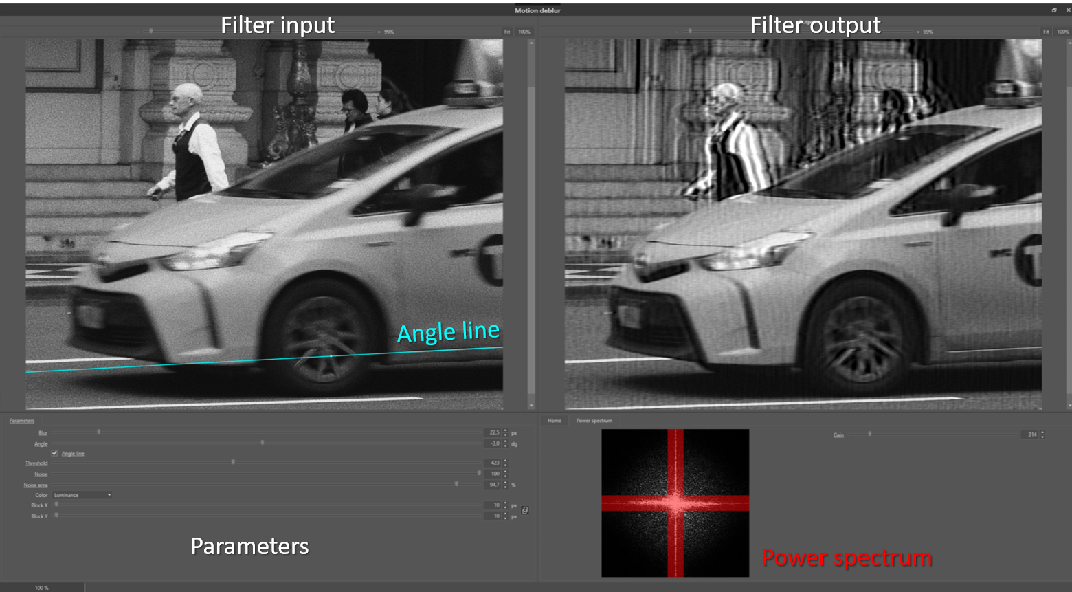 In real-life cases, the blur streaks (Figure 4) might be less obvious to find, see, for example Figure 5 and 6. The noise signal is estimated from the outer areas of the power spectrum. In Figure 7 this corresponds to the non-red areas. With the Noise Area parameter, which acts as a cut off between signal and noise frequencies, these areas can be adjusted. If the image contains many high-frequency features, decreasing the parameter value will help to preserve these. The Noise parameter allows the operator to tune the strength of the noise compensation of the filter. In Figure 8, the de-blur result on the front end of the taxi is displayed for different values of the so-called threshold parameter. This parameter suppresses wave-like distortions in the result images. If the parameter is chosen too large, the de-blur compensation is not so effective anymore. The color parameter enables the de-blur on the luminance or individual colour channels.