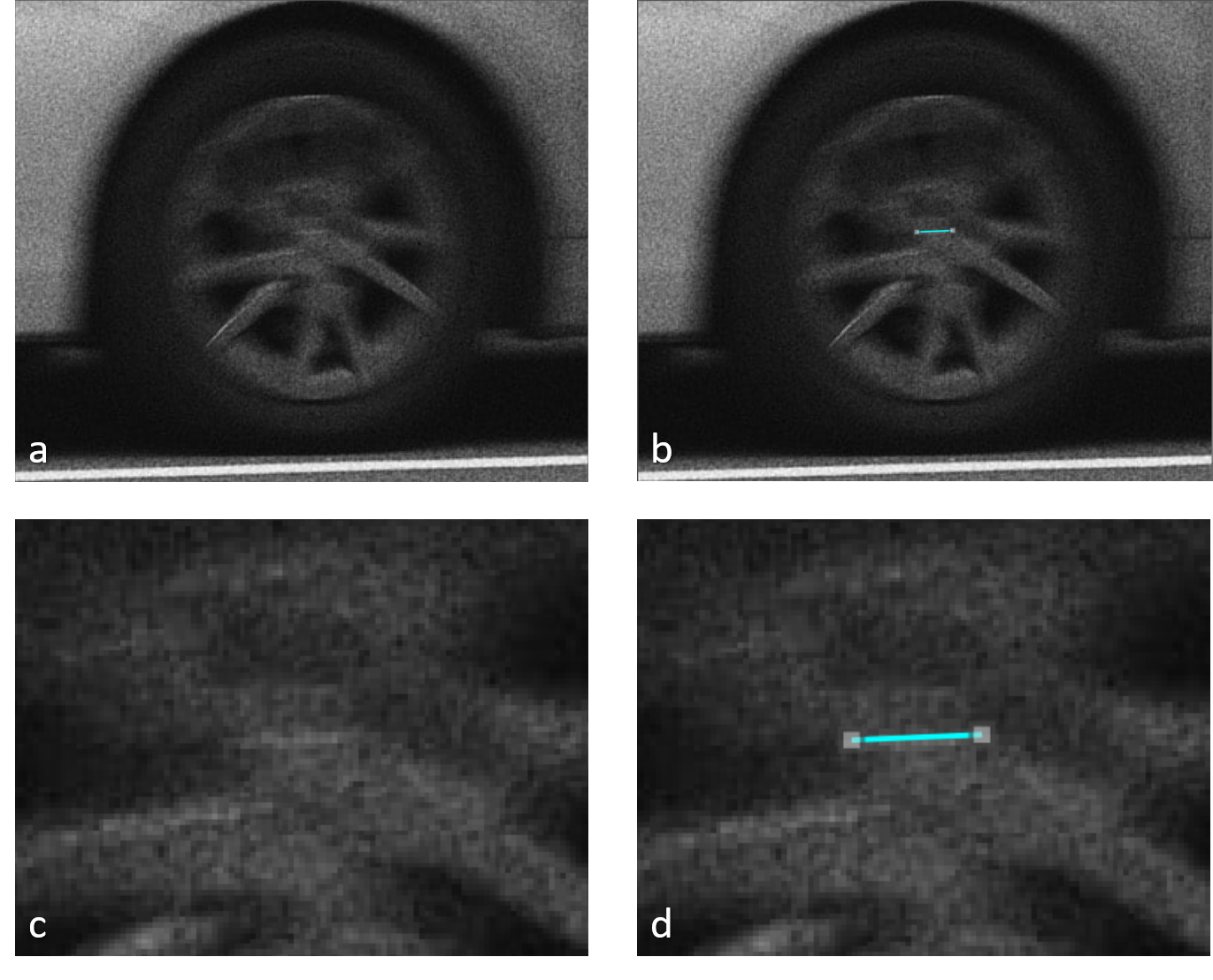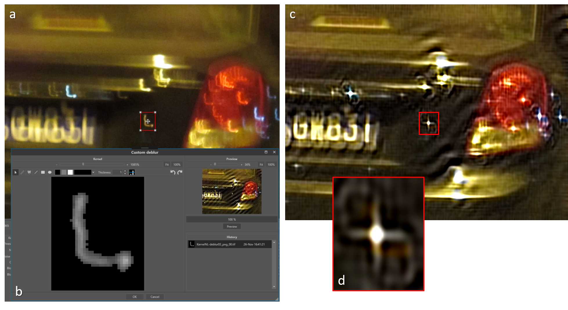 In case the blur effect in an image is caused by non-linear motion or a complex composition of multiple blur types, one can apply the so-called custom de-blur filter. In Figure 11 an example is shown of a non-linear accelerated motion. The motion blur, in this case, is very complex, and so could not be modelled by a curved line, since the motion was accelerated, resulting in intensity variations along the curve. If the blur kernel feature can be isolated, it can be used to compensate for the complex blur pattern it represents. Ideally, the blur kernel is in the filtered image changed into a single dot. Therefore, if one knows that some blurry feature in an image should originate from a point-like shape, one can use this blurry feature for extraction of the blur kernel using the custom de-blur filter. The above extraction procedure is independent of the complexity of the blur pattern in the image. The only condition is that it should be possible to separate the blur feature from the background. To further facilitate this process, extra ‘drawing’ options (Figure 11 b) are available to retouch the extracted blur kernel. The hash of the extracted kernel image is included in the processing log to guarantee reproducibility.