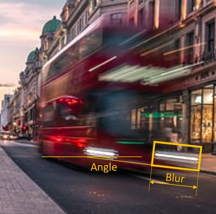 During the shutter time of the recording of a single frame or still image, the camera or object(s) of interest or both can move. If the motion is fast relative to the duration of the shutter time, this results in so-called blur streaks. To compensate for the effect the Blur parameter should have a value which corresponds to the length of the blur streak. The Angle parameter should correspond to the angle between the streak and the horizontal axis. Both parameters control the shape and extent of the PSF function of formula (1).