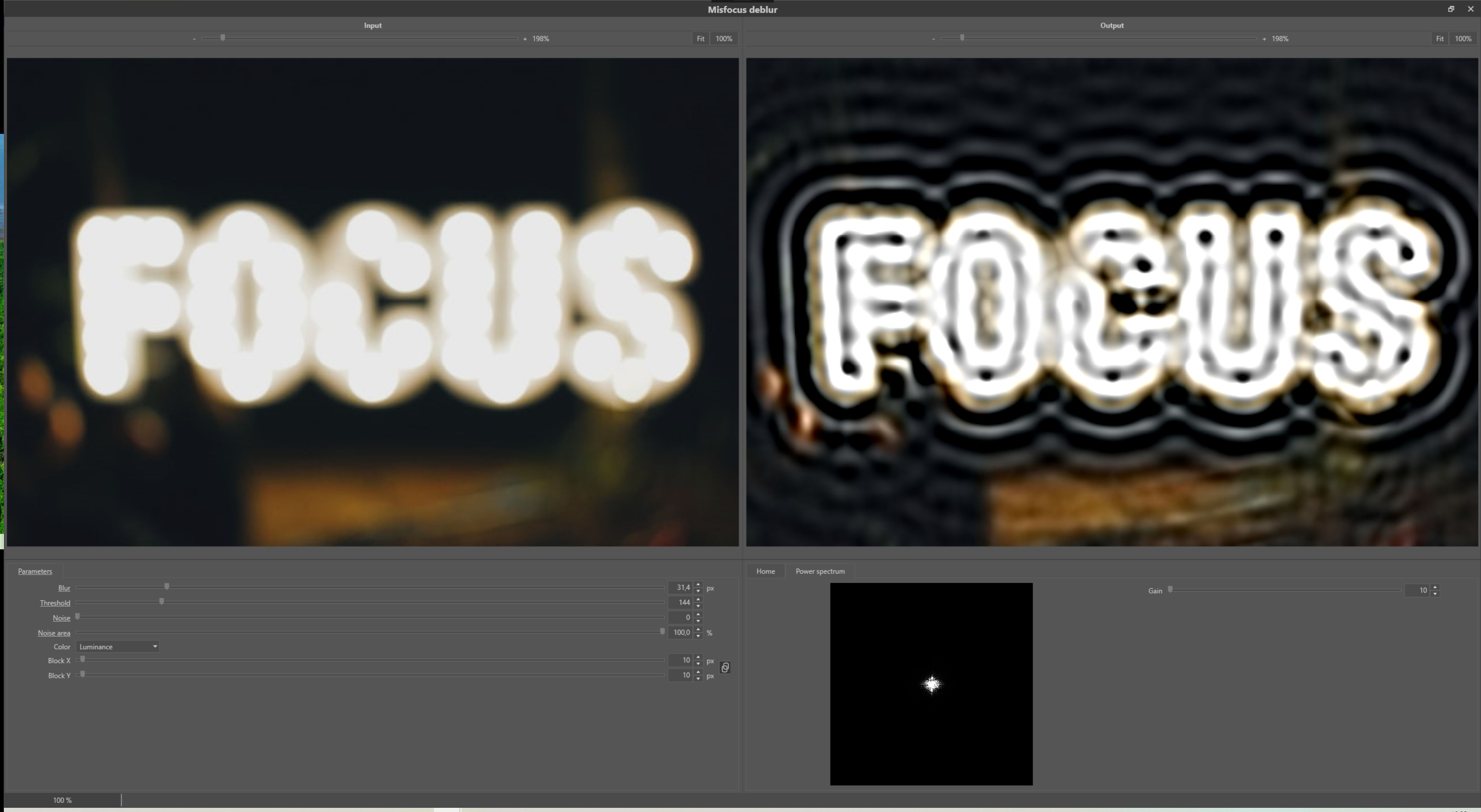 Examples of misfocus are shown in Figure 9 and 10. The blur effect has the shape of circles. The misfocus de-blur or defocus filter should have a Blur parameter value corresponding to the radius of the blur circles.