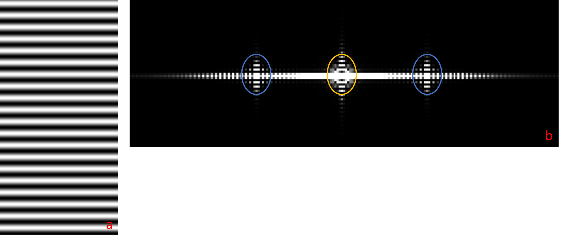 A one-dimensional time signal is decomposed in one or more frequencies (in this case a single frequency), displayed in the one-dimensional power spectrum. Similarly, an image with two spatial coordinates in pixels can be decomposed into a two-dimensional power spectrum. This is shown in Figure 2, where an image with a sine wave results in a power spectrum with two main frequencies inside the blue ellipses. The origin is indicated by the yellow ellipse (frequency value zero), which corresponds to the average brightness level in the image. The outer areas of the power spectrum correspond to the high frequencies in the image. The high frequencies represent both noise signal and the fine details of the image (sharp contours). Notice that the axis in the power spectrum is rotated over 90 degrees relative to the direct space image coordinates. A natural image can be considered to be build up by many sine waves of different magnitudes (amplitudes), frequencies, directions and starting points (phase). The power spectrum of a natural image is, therefore, more complex, see for example Figure 3.