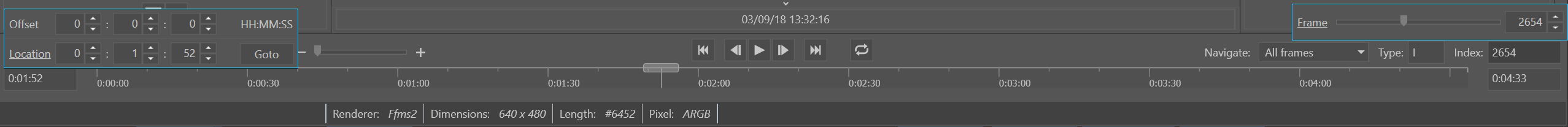 - Goto specified time: navigate to a video frame, using a user specified time. Click inside the time edit box to show the time control.