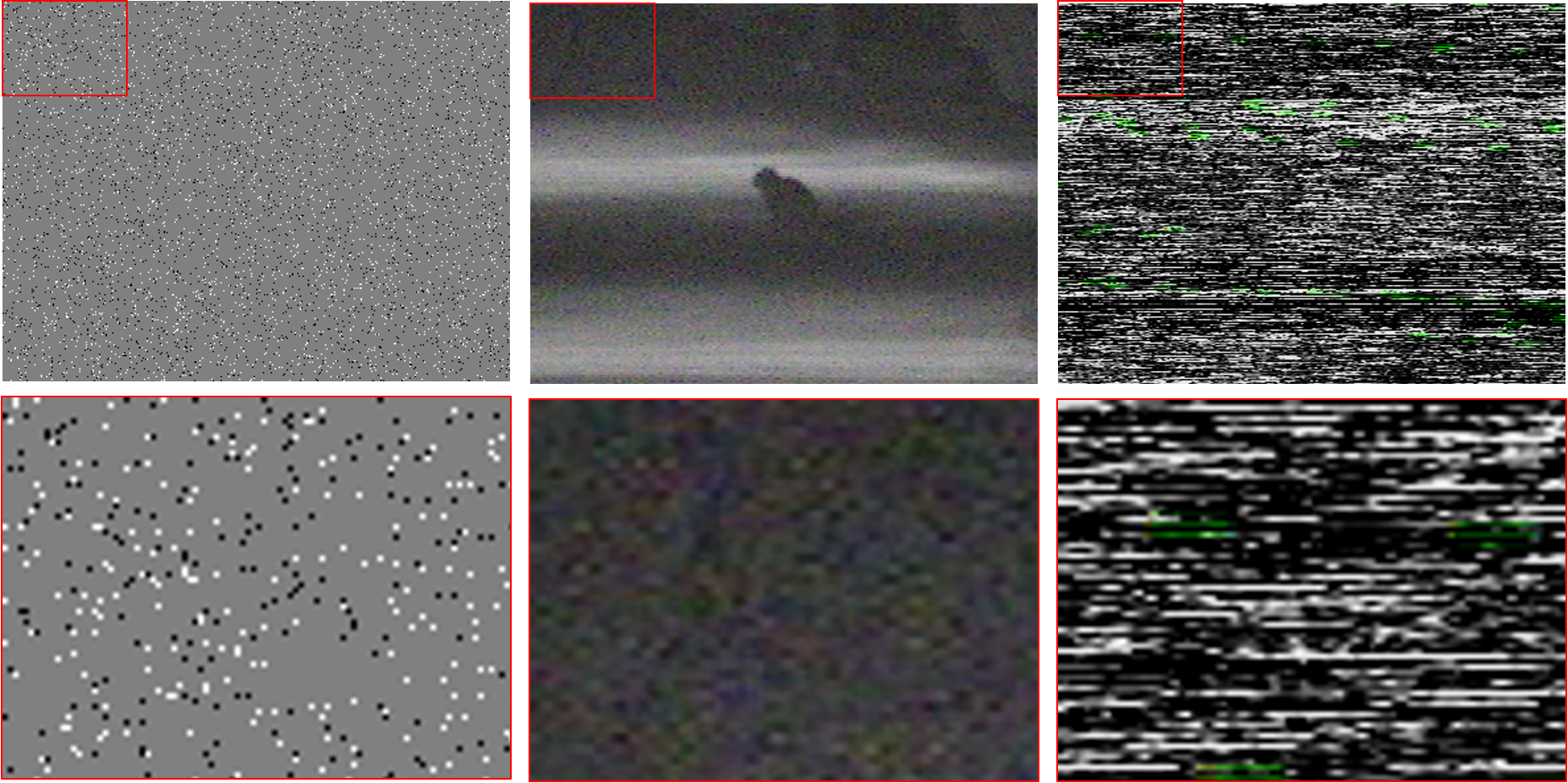 The most commonly encountered types of noise (see Figure 1) are impulse noise (also known as salt and pepper noise due to its speckled black and white appearance), pattern noise and line noise. Impulse noise is characterised by the visibility of random black and white pixels throughout an image, caused by dead pixels in the imaging sensor or the addition of electronic noise prior to encoding. Pattern noise is visible as coloured pixels generated by the variation in the three colour sensors or the analogue to digital conversion process. When there is a composite analogue connection between a camera and a recorder, there is only a single channel available to transmit the data. The colour information is therefore encoded in a high frequency carrier wave, and the signal digitised once it reaches the recorder. The overlap between the high frequency luminance and colour information causes misinterpretation by the frame grabber of the high frequencies as colour which results in colour distortion. This can also occur in black and white captures. Line noise is visible as vertical or horizontal light or dark lines and is generally caused by synchronisation issues in the sensor [2].