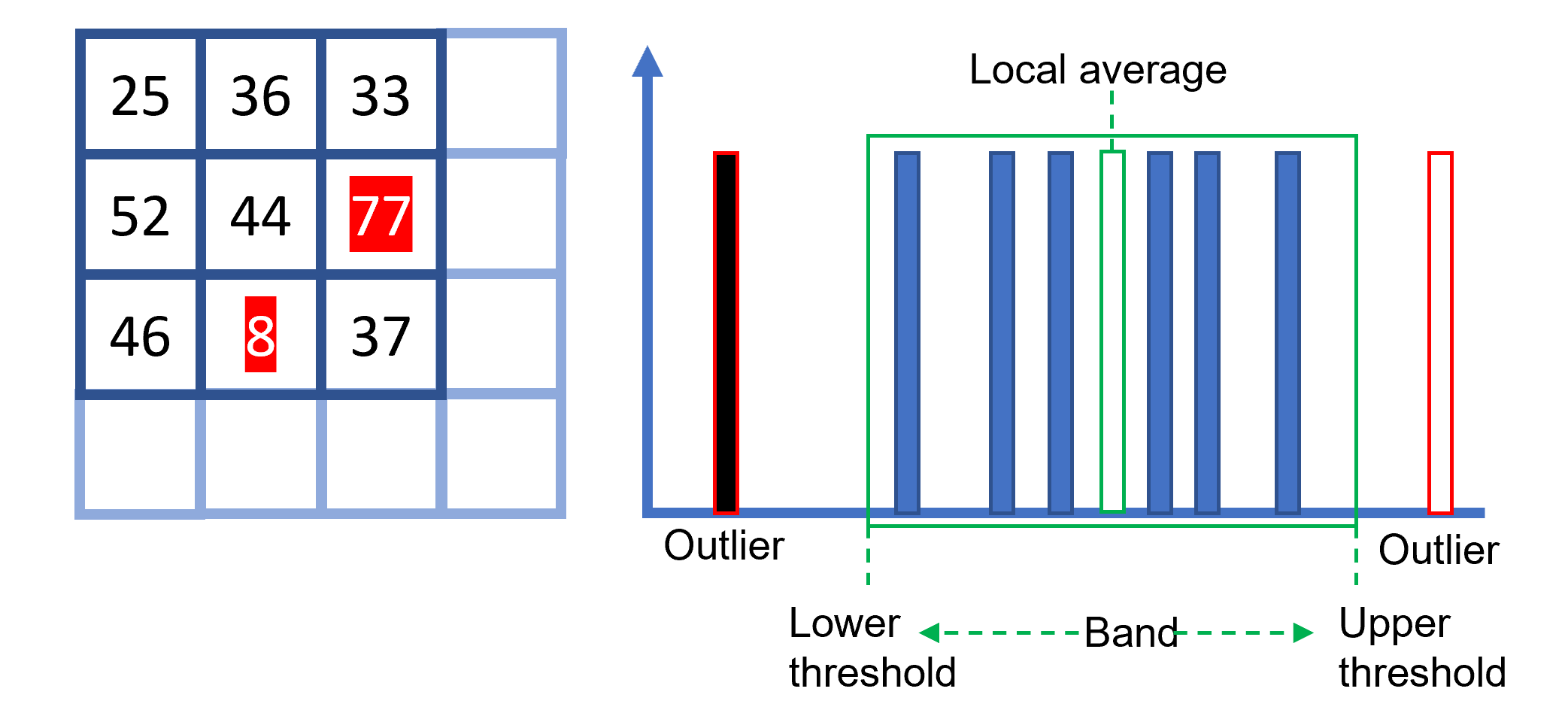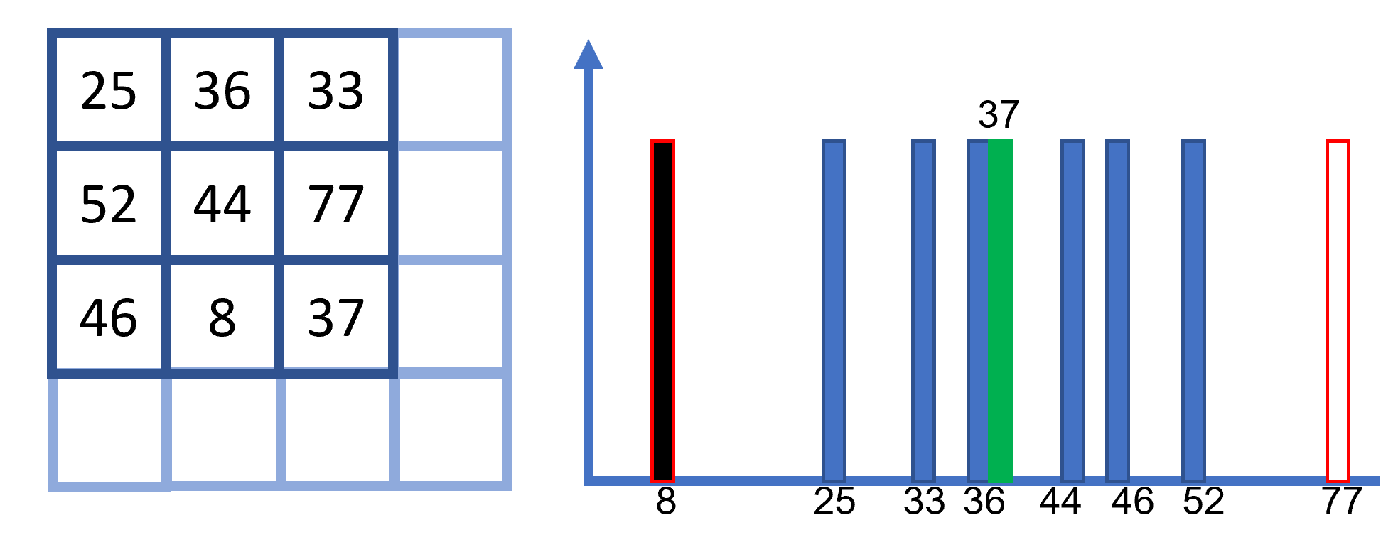 The median filter ([2] page 108 and [3] page 130), is a noise reduction filter best applied as a solution for impulse noise. For every input pixel, the histogram of a local environment is calculated, and the resulting output pixel is the median value of the local histogram (see Figure 4), thus eliminating outlier pixel values. Besides a standard implementation of the median filter, Impress also offers the so-called band implementation (see Figure 5). This implementation has an extra parameter entitled ‘Threshold’ that is used to distinguish outlier pixels from ‘normal’ pixels. The filter only replaces the outlier pixels by the local histogram median value, leaving the normal pixels untouched.