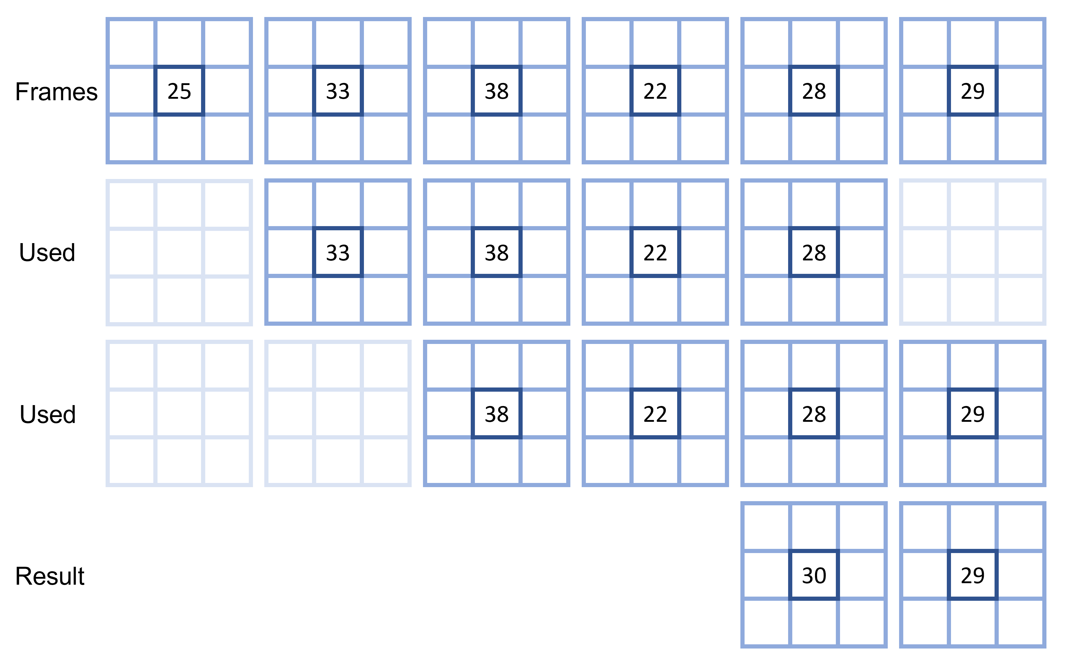 When noise exists within a video, the frame average filter only offers a solution in cases where h which the desired region is stationary. Where this is not the case, the so-called temporal smoothing filter [4] page 228 might be useful. Using the box filter from part 1, the average pixel values are calculated from the local neighbourhood of a pixel location in a process that can be described as spatial smoothing. The average pixel value for frame averaging is then calculated for all frames in a video. In contrast, the average pixel value in temporal smoothing is determined over a limited number of subsequent frames (see Figure 8). The weights of the pixel values of the subsequent frames can be constant for a certain interval (box function). Another implementation of this temporal smoothing has weights that become smaller as you go back further in time. The most recent frames contribute the most. A third implementation of temporal smoothing uses the temporal median value over a time range, eliminating outlier pixel values.