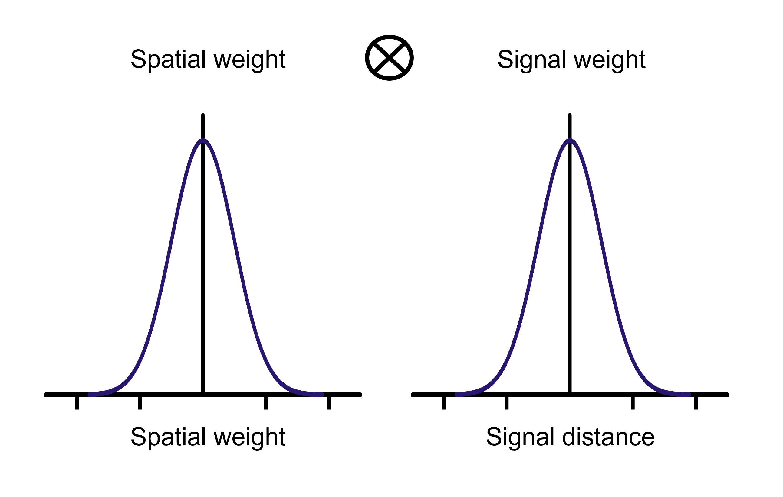 The bilateral filter [2] page 110, is a variant of the lowpass filter. The resultant pixel gets the local weighted average of a small rectangle. However, the weights of the contributing pixel values are not only determined by the distance from the result pixel location (special weight): the larger the deviation of a pixel value from the local average value, the smaller the signal weight will be for that pixel. The total weight for a contributing pixel is the product of signal and special weight (see Figure 6). This approach reduces the undesirable influence of outlier pixels on the local averaging process.