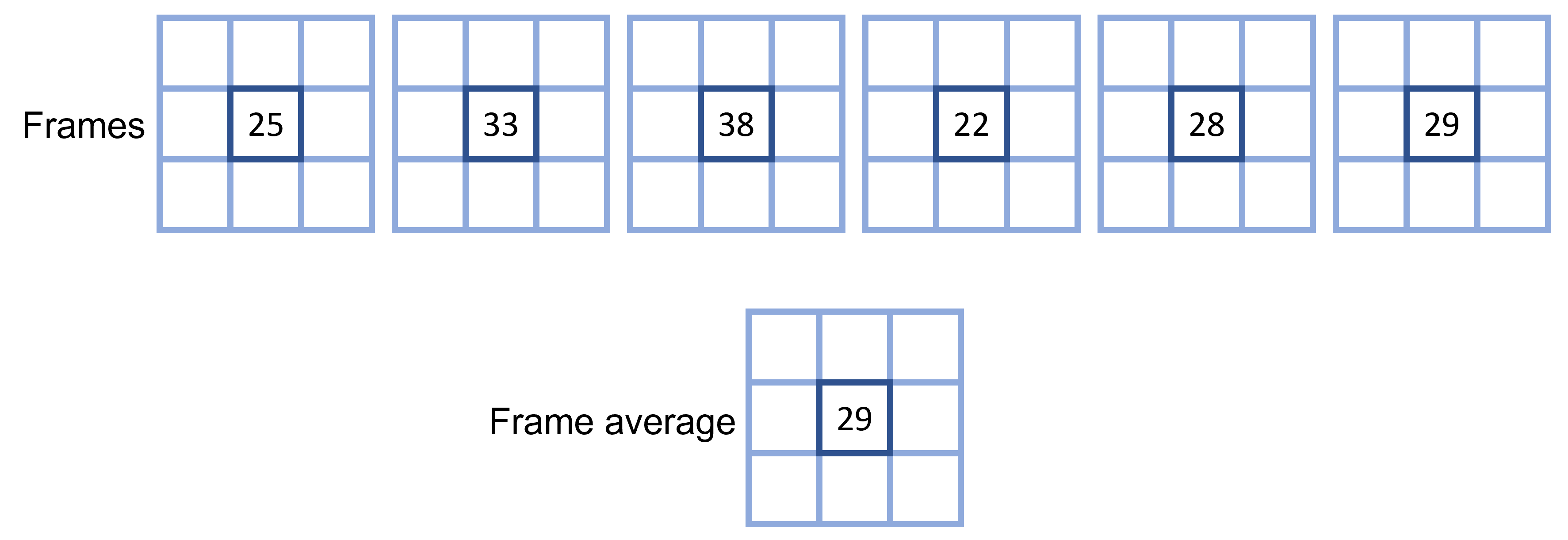 In cases in which noise reduction is required for a video sequence, it can be accomplished by so-called frame averaging [4] page 32. This is premised on the assumption that the scene is stationary, and thus the only difference between the pixel values from subsequent video frames within the same image coordinates is the temporal fluctuating noise signal. By determining the temporal average for each pixel location, a single image with suppressed noise signal can be constructed (see Figure 7).
