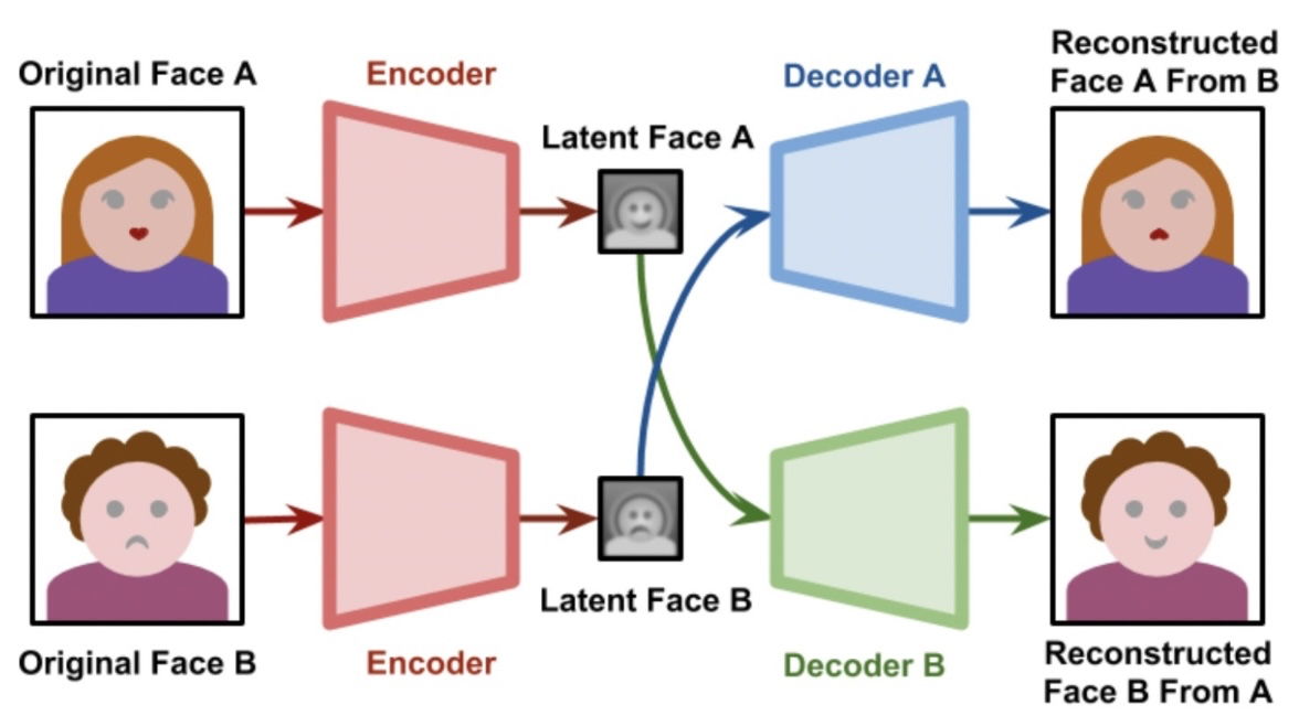 Deepfakes have become popular due to the easy-to-use ability of their applications to a wide range of users with or without computer skills. To this end, deep learning techniques have been applied representing complex and high dimensional data. The first instance of deepfake generation, i.e. FakeApp, was developed by a Reddit user deploying autoencoder-decoder pairing structure [3]. This method uses an autoencoder that extracts latent elements of face images and a decoder which reconstructs the face images. To swap faces of two target images, two encoder-decoder pairs with the same encoder are needed.