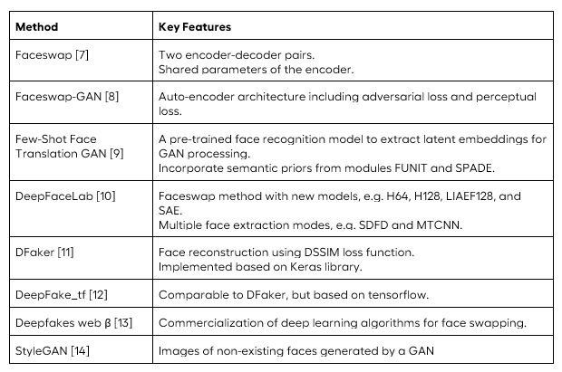 By implementing adversarial loss and perceptual loss to the encoder-decoder architecture of VGGFace, an enhanced version of deepfakes based on the generative adversarial network (GAN) [5] was proposed. The VGGFace perceptual loss improves deepfake creation in a way that eye movements seem to be more realistic and consistent with input faces. In addition it contributes to smooth out artefacts resulting in higher quality output images. To make face detection and face alignment more stable the multi-task convolutional neural network (CNN) from the FaceNet implementation [6] is introduced. Notable deepfake generation methods are summarized in table 1.