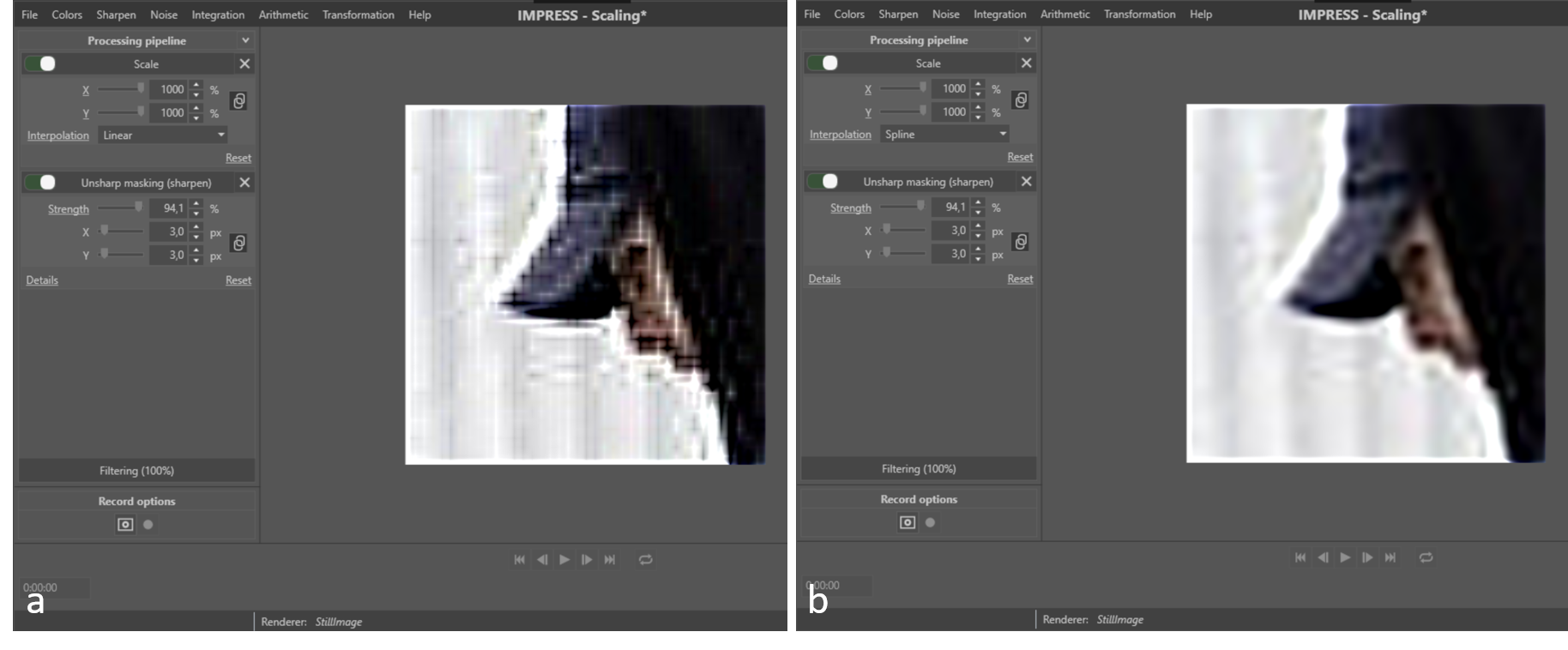 The blurriness introduced by the scaling can be compensated by using a sharpen filter after the scaling. Care should be taken to select the right interpolation and the strength of the applied sharpening. Figure 4 shows an example of combining scaling and sharpening. The strong sharpening starts to emphasise artefacts introduced by the interpolation in case of bicubic spline (Figure 4b). In case of bilinear interpolation (Figure 4a), using the same sharpening, the result is much worse.
