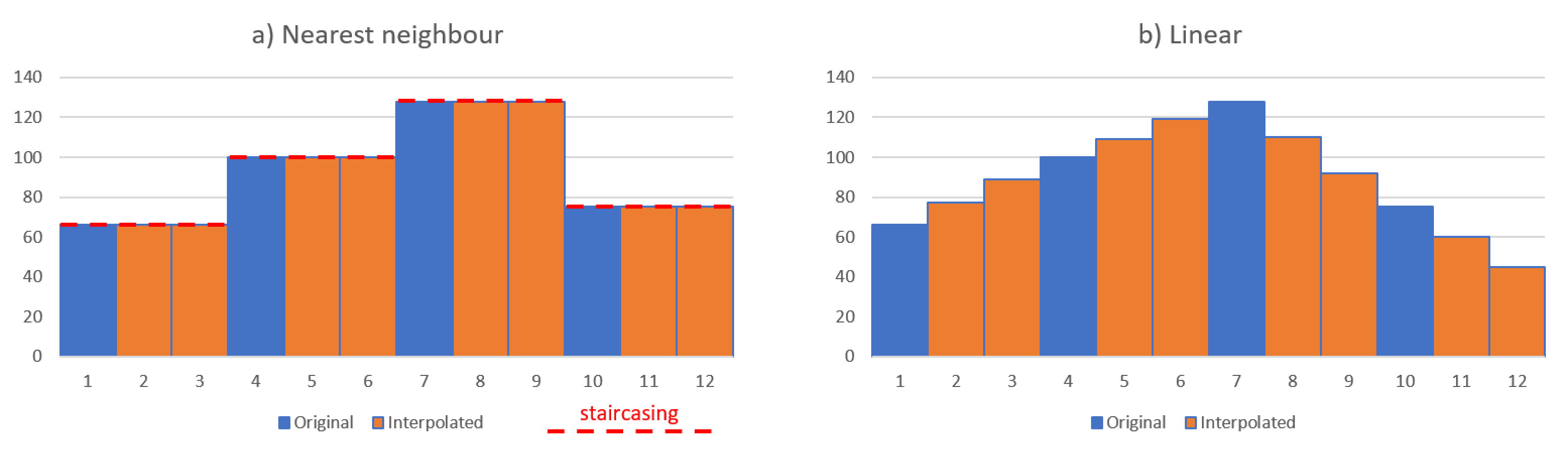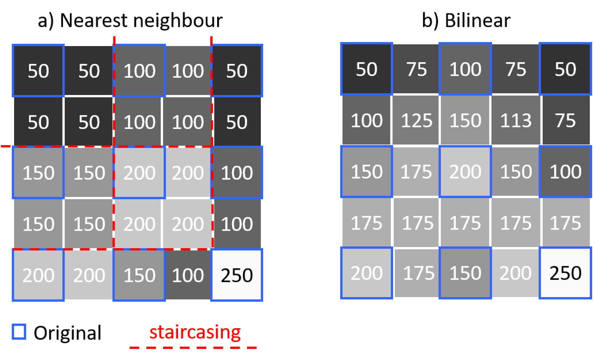 Linear – Uses two values either side of the new pixel (see Figure 1b), where the value of the new pixel is taken from the mean of the values of the existing pixels.