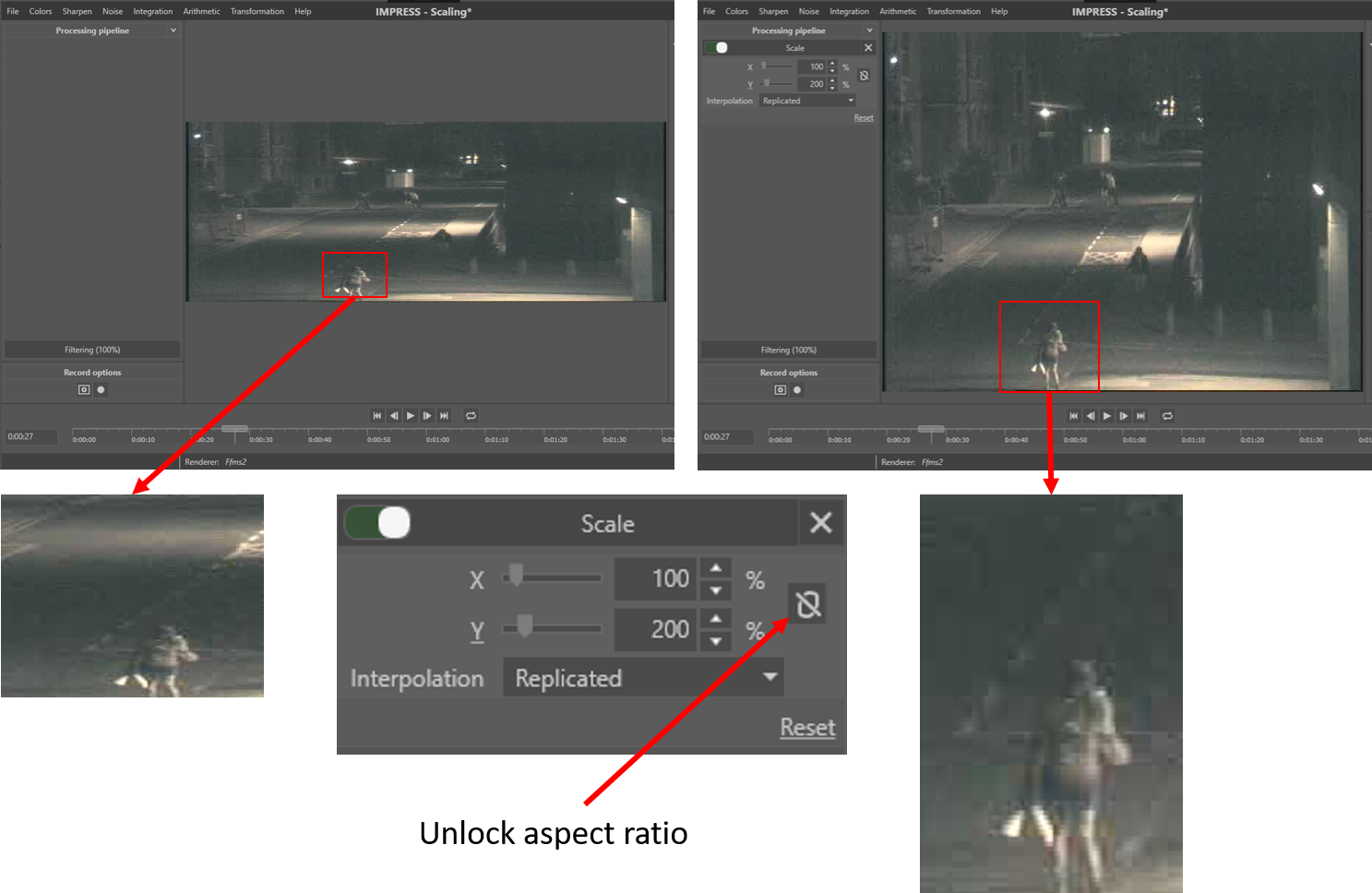 The aspect ratio of an image is the ratio of width and height (width / height). In some cases an image do not give a good representation of objects from the real world in the image, because the aspect ratio is incorrect (see Fig.5). This can be the result of the recording technique or partially corrupt image data. The scaling filter can be used to adjust the image dimensions to better fit the real world aspect ratio. The operator has to unlock the aspect ratio (Fig. 5), in which case the horizontal and vertical scaling factor can be set independently.