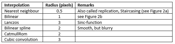Interpolation techniques use different mathematical functions to interpolate the pixel values, and as such, the number of neighbouring pixels that are used to calculate the result value differ. The local neighbourhood used to calculate the interpolated value can be characterised by a pixel radius. The interpolation techniques for scaling available in Impress [6] are listed in Table 1.